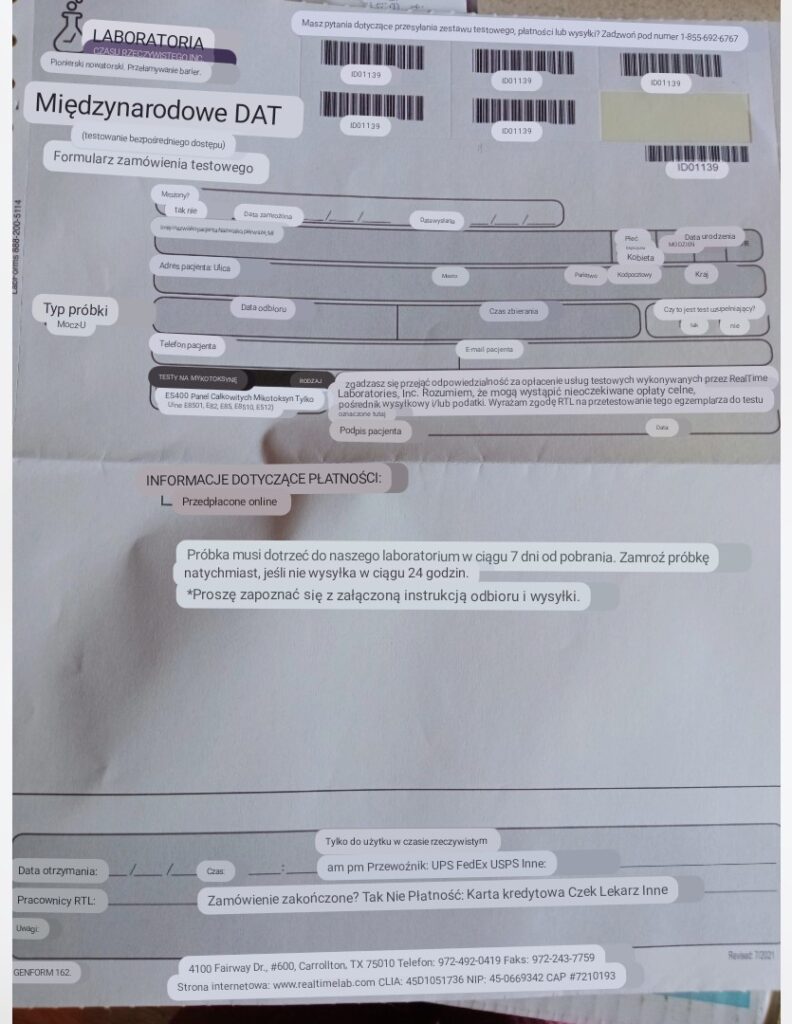 Zakupiłam test TUTAJ, wypełniłam dokumentację i wysłałam mocz w podróż. Wynik otrzymałam po ok. 10 dniach na maila.